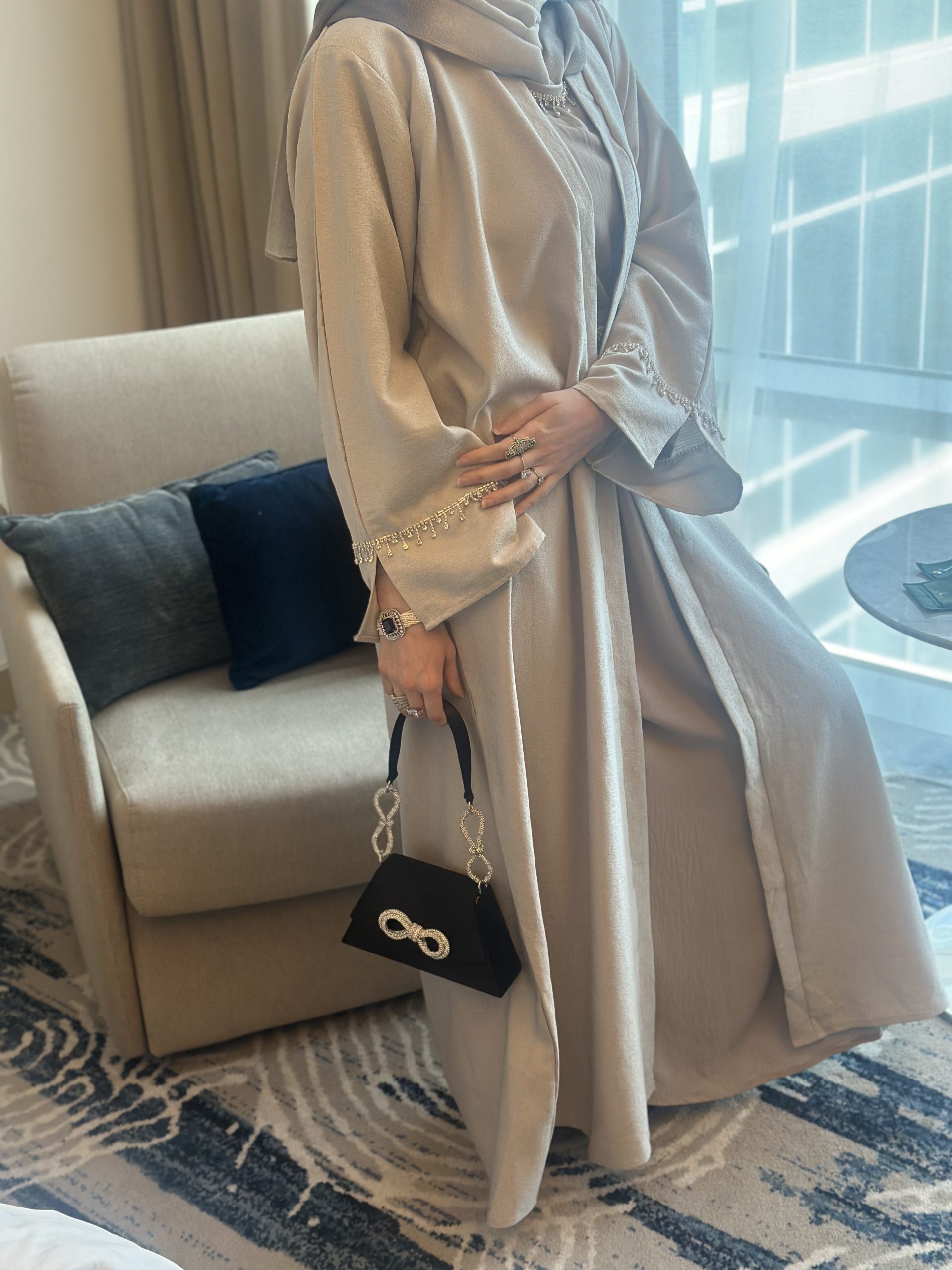 Cet ensemble se compose de quatre éléments : le foulard mousseline blanc, la ceinture bijou, une sous robe manches longues matière fluide coupe droite avec col bijou et une abaya kimono ouverte et fentée au niveau des poignets avec détails bijoux au niveau des manches , tissu cotton et polyester avec subtiles paillettes apparentes.